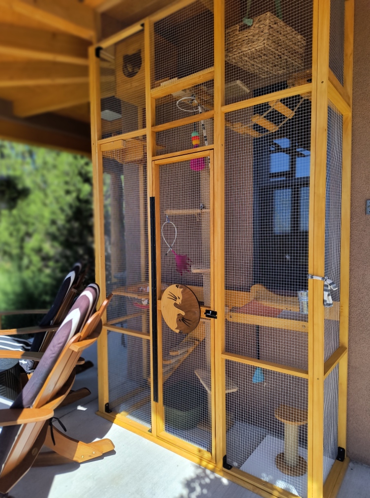 Fully screened-in and furnished 😊 catio with access through outside latched door or from interior via a window