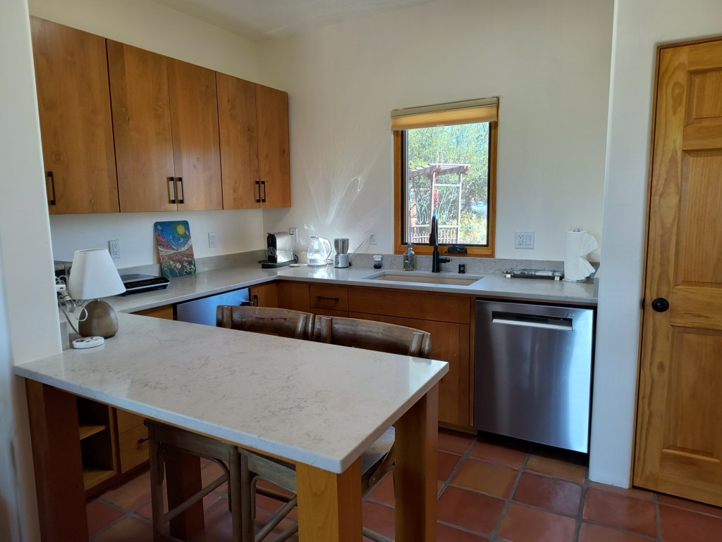 Kitchen with breakfast bar, half-fridge, dishwasher and basic countertop cooking appliances