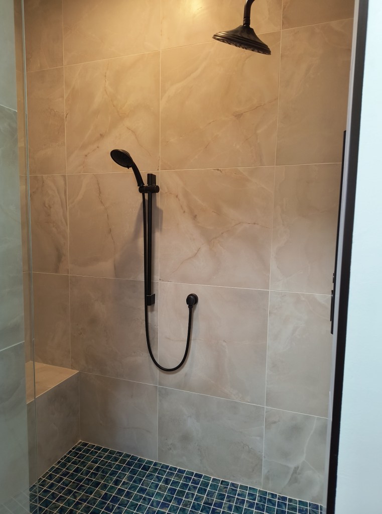 Beautifully tiled shower with banco for sitting while using handheld showerhead or rainfall showerhead for standing